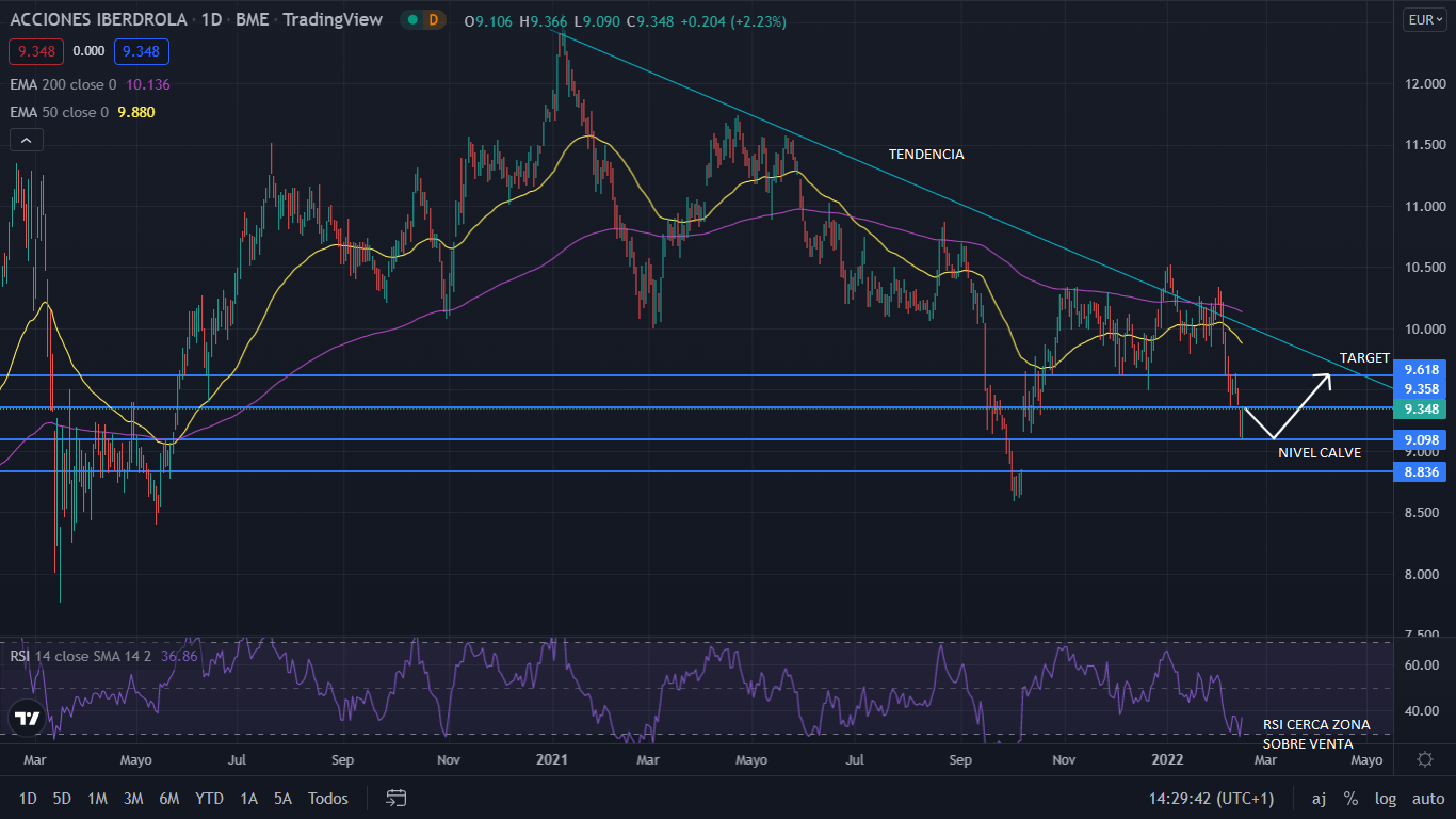 A nivel técnico, Iberdrola, viene desde el inicio de 2021, en una tendencia bajista, con la que ya ha perdió un 27,55%. Actualmente el precio se sitúa en un nivel clave para finalizar dicha tendencia, y volver a alcista. Con el soporte actual de los 9 euros, y el RSI en sobre venta, para el corto plazo, el precio irá alcista, para buscar la línea de tendencia bajista, sobre el nivel de los 9,60 euros.