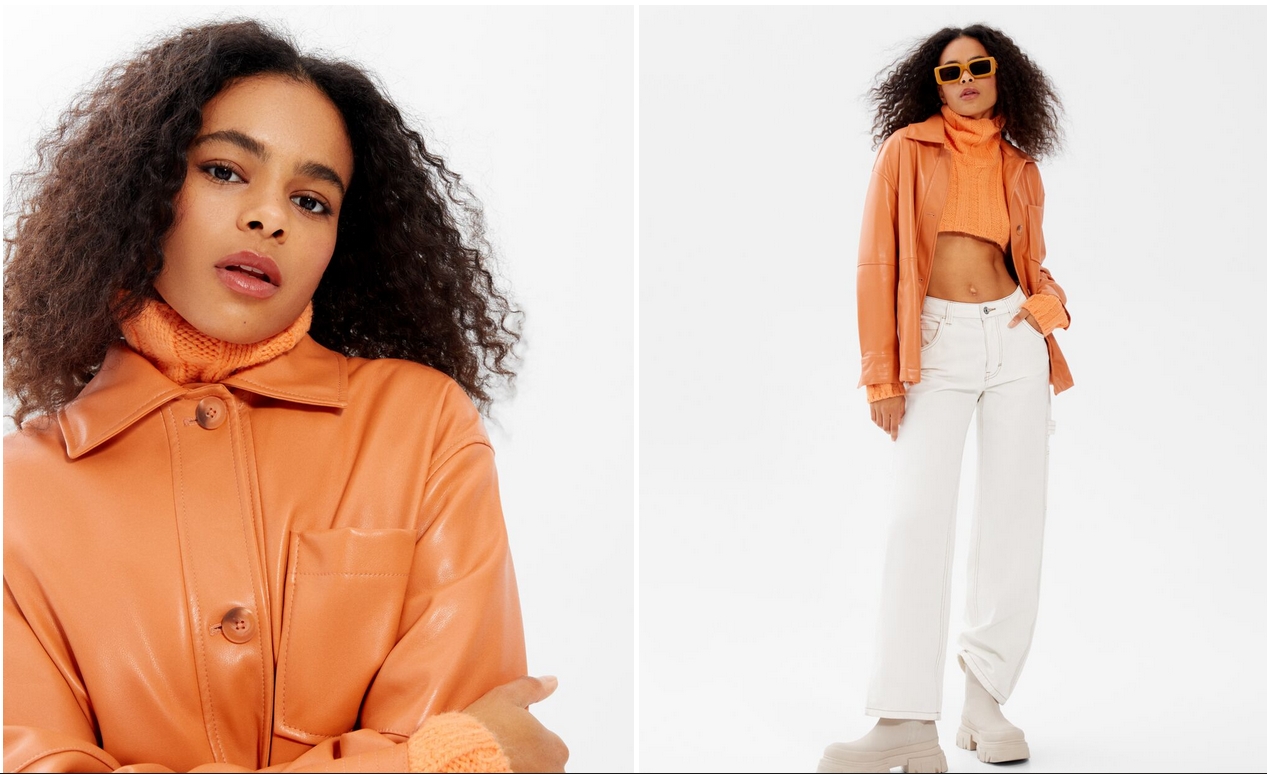 También tienes esta sobrecamisa con efecto piel en Bershka. Con varias tallas y dos colores (crudo y naranja). Su valor es de 29,99€ en cualquier caso.