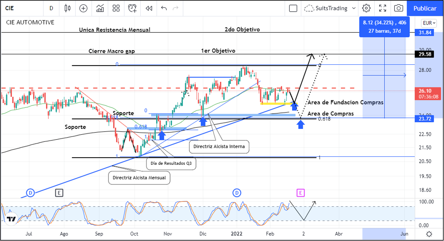 Es probable que el precio realice un movimiento más profundo a la baja que lo obligue a visitar los 23,8 euros que corresponden a la confluencia entre el siguiente soporte de octubre de 2021 y el área de regularidad en el 61,8 de retroceso de Fibonacci de la última extensión, desde allí podríamos obtener mejor precio de entrada. Si por alguna razón, la acción realiza la ruptura de dicha área, sería recomendable dejar pasar cualquier nueva oportunidad en las acciones de CIE Automotive puesto que se podría lastrar hasta los 12 euros que nadie quiere ver.