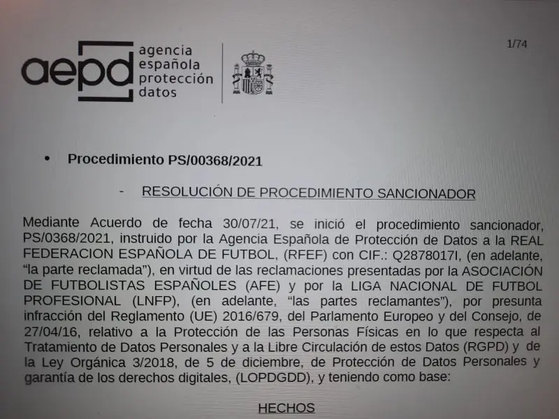 Finalmente, la directora de la Agencia Española de Protección de Datos, Mar España, resuelve imponer a la RFEF una sanción total de 200.000 euros: 100.000 euros por una infracción del artículo 13 del RGPD y otros 100.000 euros por una infracción del artículo 6.1 del RGPD.