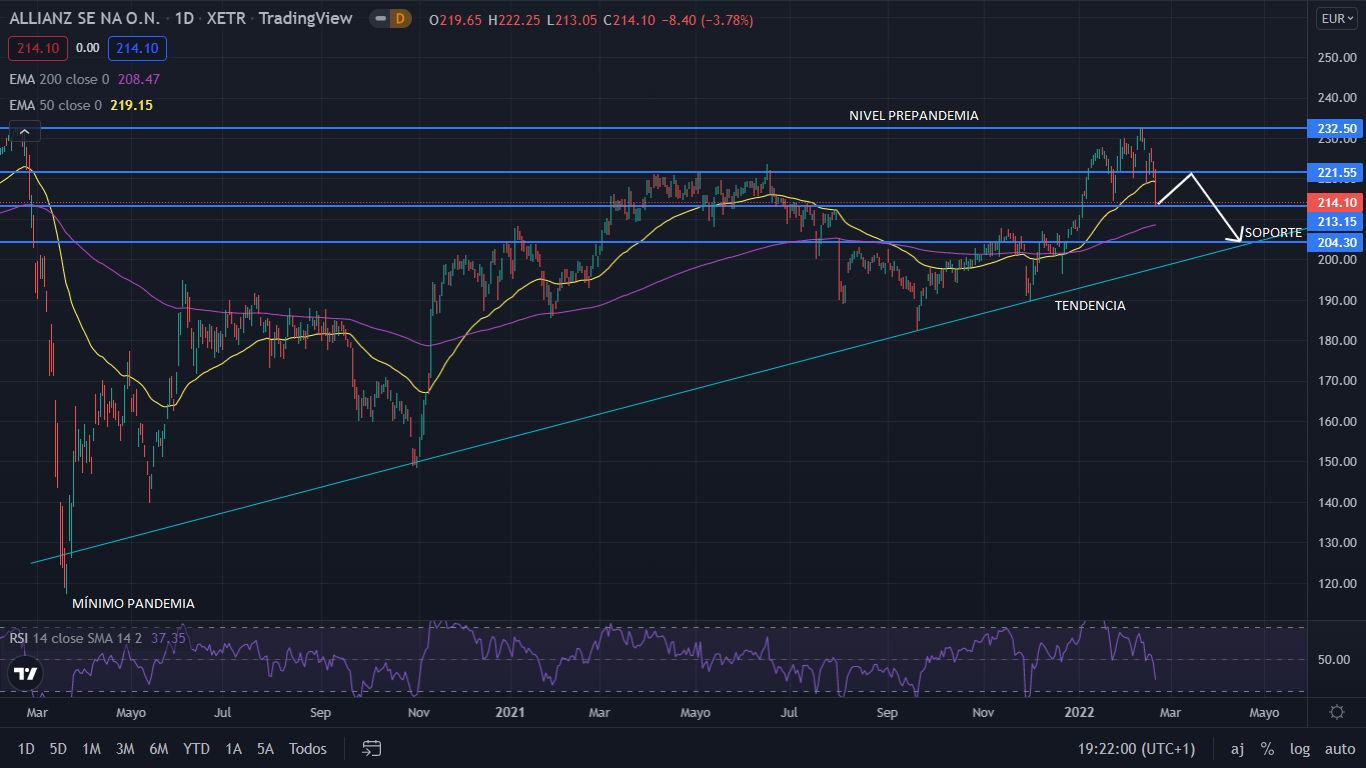 A nivel técnico, desde el mínimo marcado por la pandemia en los 117,55 euros, Allianz se ha movido en una tendencia alcista, subiendo un 83% (Precio actual). El pasado 9 de febrero, el precio tocaba los 231,95 euros, siendo este su nivel prepandemia, y su precio más alto desde 2002. Actualmente el precio ha caído un 4% tras la publicación de sus resultados de 2021, situando el precio en los 214 euros. La proyección para el corto-medio plazo, es bajista con el nivel de los 204 euros como soporte objetivo, junto a la línea de tendencia alcista.