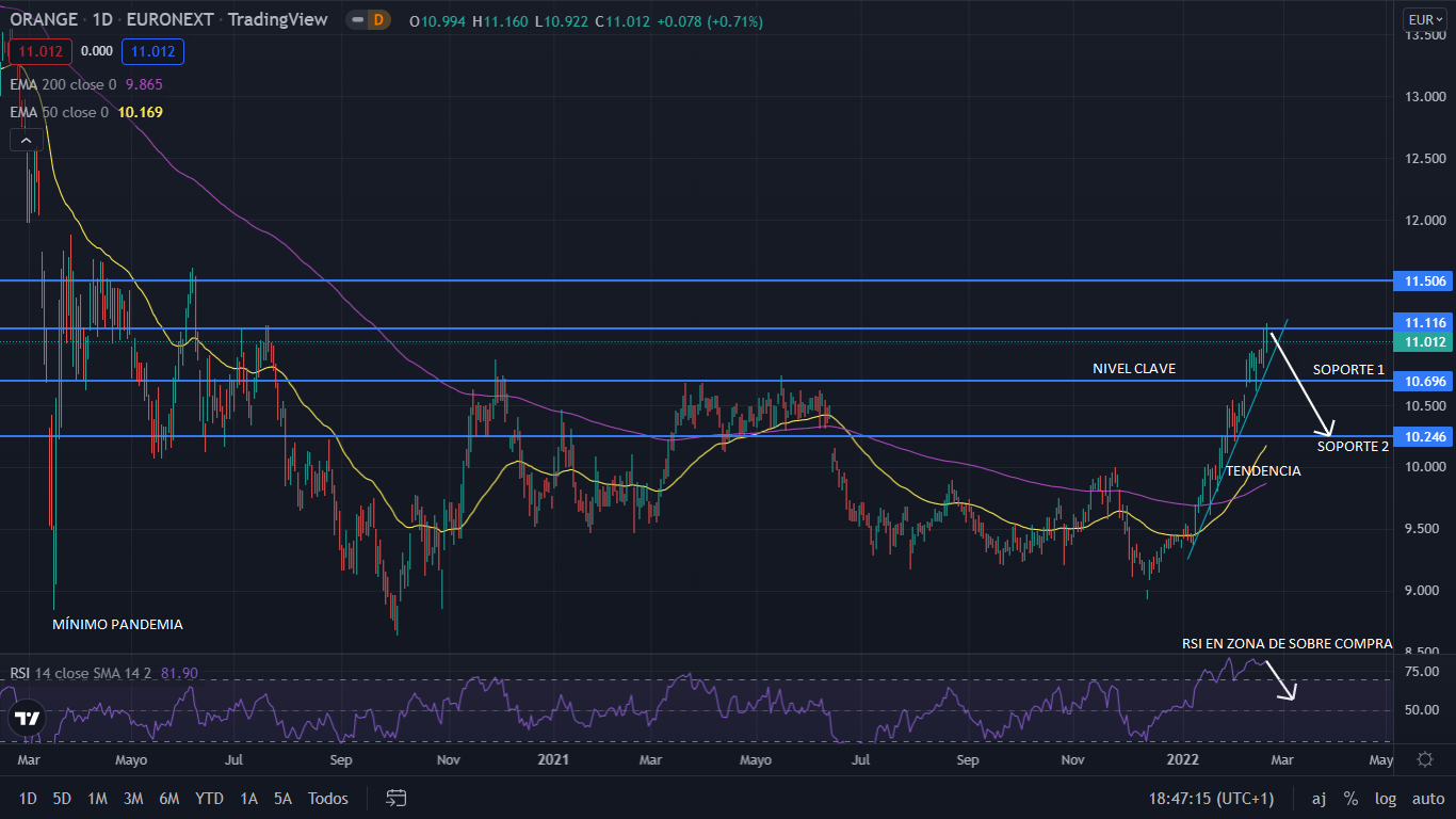 A nivel técnico, durante 2021, Orange se ha movido lateral entre los 9 y 10,69 euros. Desde el inicio de 2022, su precio se establecía en una tendencia alcista, llevando el precio hasta los 11,16 euros. Actualmente con el precio en los 11 euros, la fuerte subida, el RSI en sobre compra y el precio tan lejos de la media móvil de 50 periodos; lleva a una proyección para el corto plazo bajista, dejando el precio en una corrección hasta el nivel de los 10,24 euros. Para el medio plazo, Orange rebotaría en los 10,24 euros, para volver alcista.