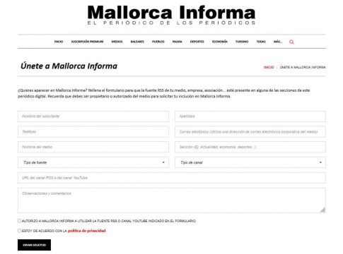 De hecho, Mallorca Informa cuenta con un formulario abierto a cualquier medio de comunicación, asociación o empresa que solicite integrar su feed RSS o canal Youtube dentro de Mallorca Informa, garantizándoles siempre la autoría del medio original y el enlace directo a la noticia del medio solicitante.