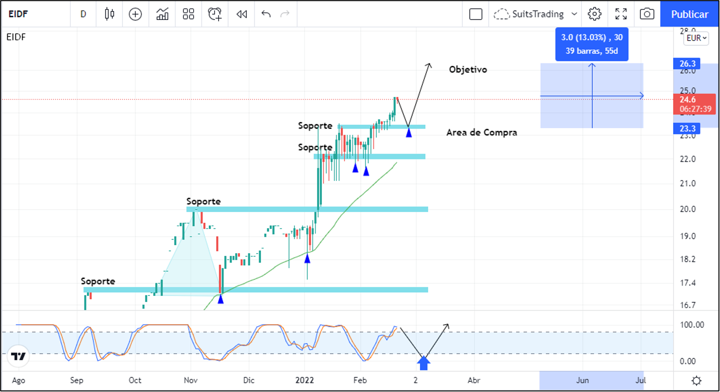 Sí detallamos el gráfico de marco diario para la acción de Energía, innovación y Desarrollo Fotovoltaico (EiDF), encontramos la marca de los últimos cuatro soportes que el precio viene dejando a su paso sobre la senda alcista. Podemos estimar que ante cualquier retroceso el precio se apoya en dichos soportes realizando un impacto al alza en dos veces a una el retroceso previo. La medida de los retrocesos es de -13% de desvalorización con avance de +35% de revalorización trabajando siempre sobre la media móvil exponencial de 50 periodos de corto plazo.