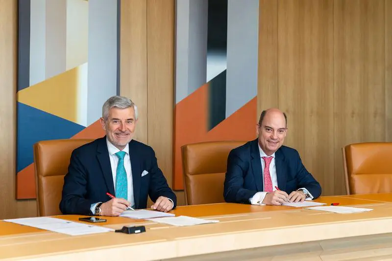 El director general de Banca Comercial de Santander España, Ángel Rivera, y el vicepresidente de Mapfre y consejero delegado de la compañía en Iberia, José Manuel Inchausti, han firmado este martes el acuerdo por el que Santander Seguros y Mapfre se reparten el 50% de la nueva sociedad, que trabajará en el diseño, la configuración y las condiciones de la hipoteca inversa, con el foco en ofrecer al cliente sénior servicios de valor y adaptados a sus necesidades, con procesos sencillos para facilitar la contratación del producto.