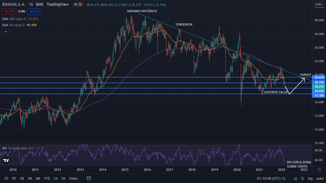 A nivel técnico, en gráfico semanal, Enagás continuará con la tendencia bajista que inicio en 2016 tras su máximo histórico, siendo una caída del 37%. Actualmente el precio se sitúa en los 18 euros, siendo los 17 euros un soporte clave. Para el corto plazo, el precio continuará basita hasta dicho soporte, donde rebotará e irá alcista, hasta los 19,65 euros, junto a la línea de tendencia bajista.