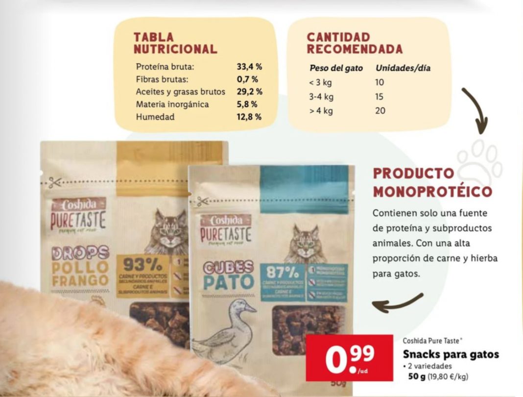 La línea Pure Taste de Lidl cuenta con unos deliciosos snacks para gatos en dos variedades. Se trata de un producto monoprotéico que cuida la salud de tu mascota a través de sus ingredientes naturales. Tan solo contiene una fuente de proteína y subproductos animales. Además, la proporción tanto de carne como de hierba para gatos es alta. Por su sabor, independientemente de que escojas los cubes de pato o los drops de pollo frango, conseguirás que a tu gato se le haga la boca agua. Puedes encontrarlos por solo 0,99 € en cualquier punto de venta de la compañía alemana. Sigue leyendo para descubrir otros productos que cuiden la alimentación de tu mascota.