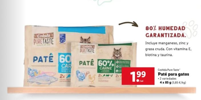 Este alimento elaborado para los mininos es de los que mejores valores nutricionales presenta de Lidl. Pertenece a la gama Pure Taste y puedes adquirirlo por solo 1,99 € en el supermercado. Entre sus propiedades se encuentran minerales como el magnesio o el zinc y vitaminas como la E. Además incorpora otros componentes beneficiosos para su organismo como la grasa cruda, la biotina y la taurina. Hay 2 variedades de sabores disponibles para que puedas escoger la preferida de tu gato.