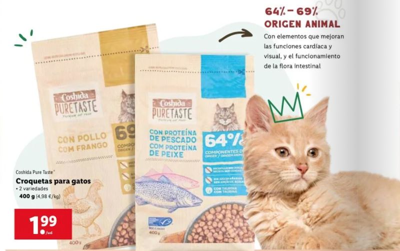 Hazte con el producto mas rico y saludable para los mininos. Se ha elaborado con ingredientes de origen animal y compuestos que desarrollan las funciones vitales del gato. Entre los beneficios que tiene para su salud, se ha demostrado que mejora la capacidad visual, las funciones cardiacas y el funcionamiento de la flora intestinal. Es de la línea de alimentación animal Pure Taste de Lidl y puedes conseguir el paquete de 400 gramos por solo 1,99 € en cualquiera de sus puntos de venta. Podrás elegir entre los sabores de pescado y pollo.