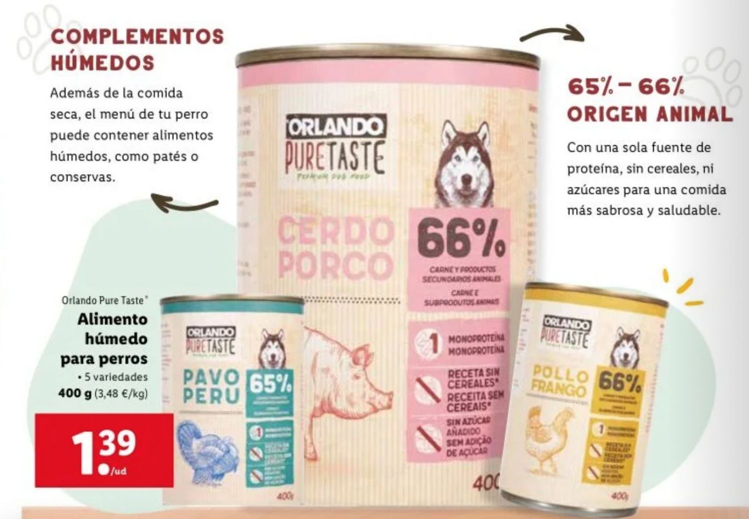 Se trata de conservas de textura suave y agradable al paladar de tu perro. Están disponibles hasta en 5 sabores, entre los que se incluyen el cerdo, el pavo o el pollo, pero con tan solo una fuente de proteína animal. Carece de cereales y azúcares consiguiendo un producto más saludable pero igual de sabroso. Es de la línea de alimentación animal Pure Taste de Lidl y puedes conseguir el bote de 400 gramos por solo 1,39 € en cualquiera de sus puntos de venta.