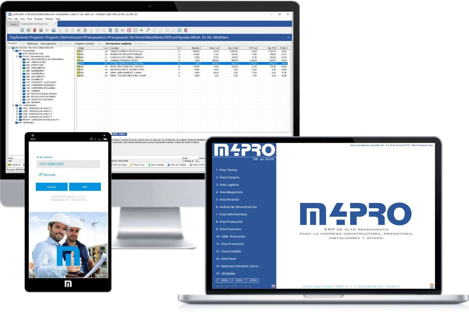 Fruto de la experiencia acumulada de más de 25 años desarrollando software de gestión empresarial para el sector, SOLINAT ha presentado la nueva versión 6 de su software m4PRO ERP Construcción. Este software supera de manera sobresaliente a otros software del mercado dentro del sector de la construcción, ya que cubre todas y cada una de las necesidades de las empresas de dicho sector. Abarcando desde la fase de estudio y proyecto de una obra, hasta la contabilización del último cobro de la misma, pasando por todos los ciclos de la misma, a lo largo de los distintos departamentos de la empresa (técnico, compras, personal, maquinaria, logístico, producción, ventas, contable, financiero, fiscal, etc.).