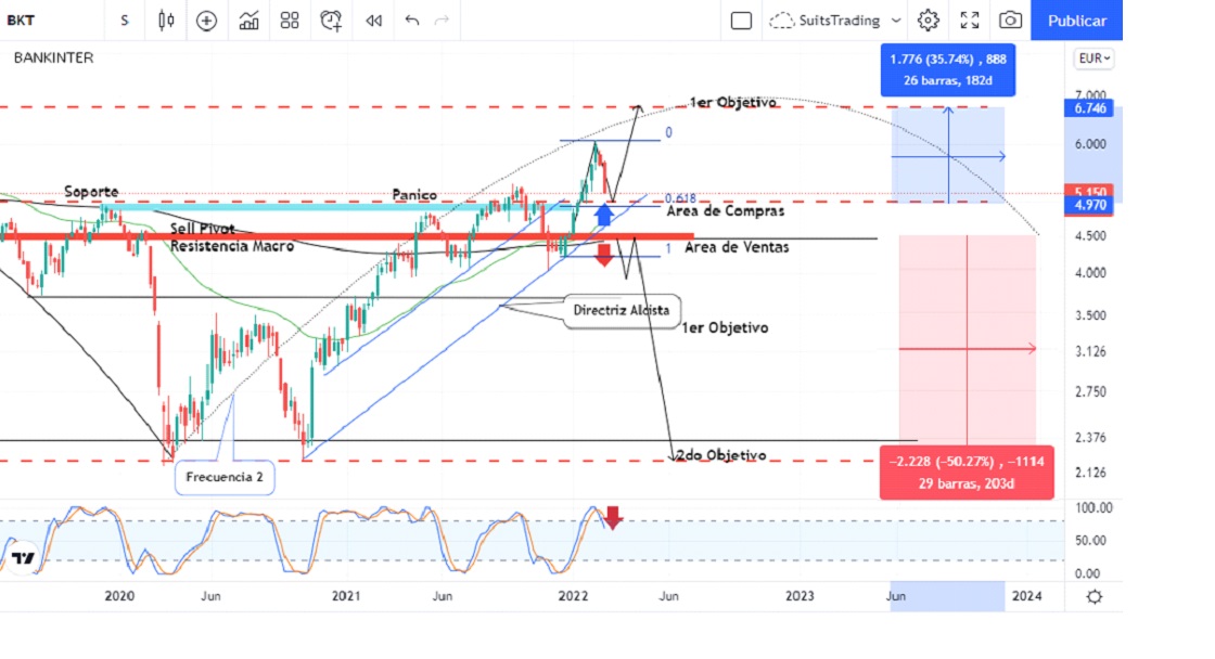 La oportunidad de comprar las acciones de Bankinter tiene como primer objetivo los máximos de enero de 2018 arriba de 6,8 euros por acción lo que corresponde a un 35% de beneficio para el mediano plazo. Sin embargo, debemos prever la situación macroeconómica y bélica actual la cual, de llegar a quebrar el área de regularidad en el 61,8 de Fibonacci, el soporte y, por ende, la última directriz alcista en formación podría generar un impacto bajista del precio de la acción de Bankinter hasta niveles de pandemia abajo de los 2 euros, es decir, hasta un -50%.