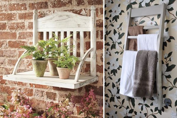 Una de las ideas más originales para darle una segunda oportunidad muy chula a las sillas viejas, es usarla como colgador y estantería para el cuarto de baño. Para ello hay que quitarle el asiento y utilizar solo el respaldo y las patas de atrás. Lo ideal es pintarla de un color suave y claro, que encaje con el ambiente del baño, y después se clava colocada al revés, para emplear los travesaños como toallero o como ganchos para utensilios.