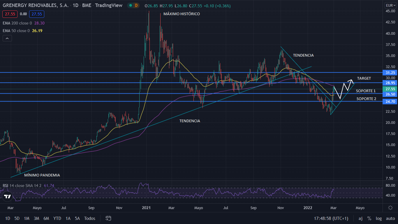 A nivel técnico, desde que marcó su máximo histórico, Grenergy cayó un 50% hasta el pasado 22 de febrero, que rebotaba en los 21,85 euros, y que, impulsado por la publicación de resultados, su precio ha subido un 30% en 8 días. Tras dicha subida, el precio salía de la tendencia bajista. La proyección en el medio plazo lo sitúa en una posible nueva tendencia alcista, con los 30 euros como objetivo.