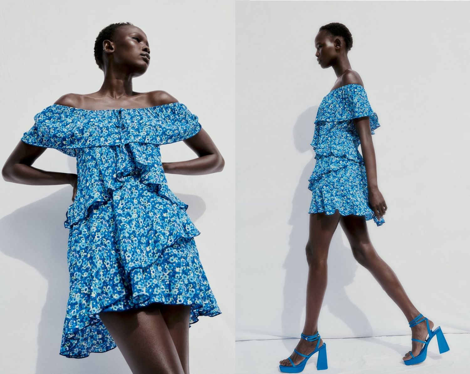También está disponible este mono estampado con volantes por 29,95€. Una prenda disponible en varias tallas y en tono azul y blanco, con estampado floral. Fabricado en 100% viscosa en su exterior y forro interno de 100% poliéster.