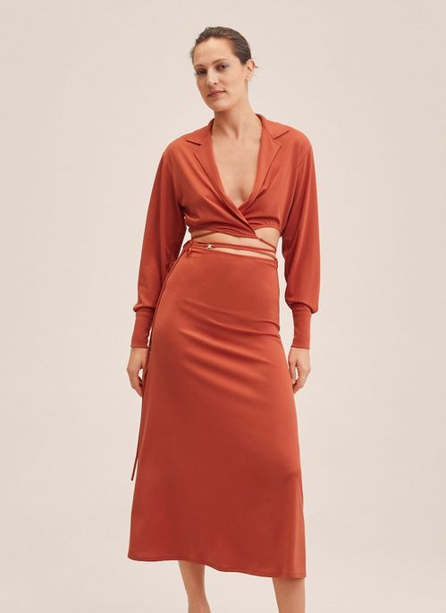 ¿Te acuerdas que al principio de este artículo te dijimos que en Mango se podían encontrar prendas con un diseño muy original? Pues esta que ves en la imagen es un claro ejemplo de ello. Se trata de una camisa tipo crop que tiene un diseño recto. Además, también destaca por tener un cuello en forma de pico con solapa y una manga larga que termina con unos puños abotonados. Y lo mejor es que sale muy bien de precio, ya que solo cuesta 25’99 euros.