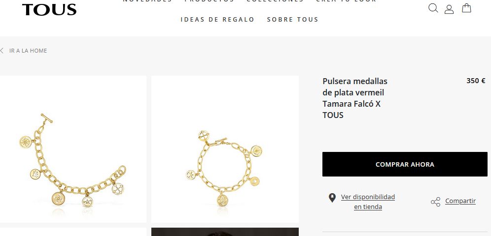 Es una pulsera tamara falcó X TOUS de plata vermeil con cinco medallas. Además, posee una longitud de la pulsera: 17,5 cm. Plata de primera ley recubierta de oro de 18kt con un espesor de 3 a 5 micras y sin ningún otro metal entre ambos. Elaborada con una técnica de producción Fundición. Entonces, si desean comprar esta prenda solo deben entrar a Tous por 350 €.