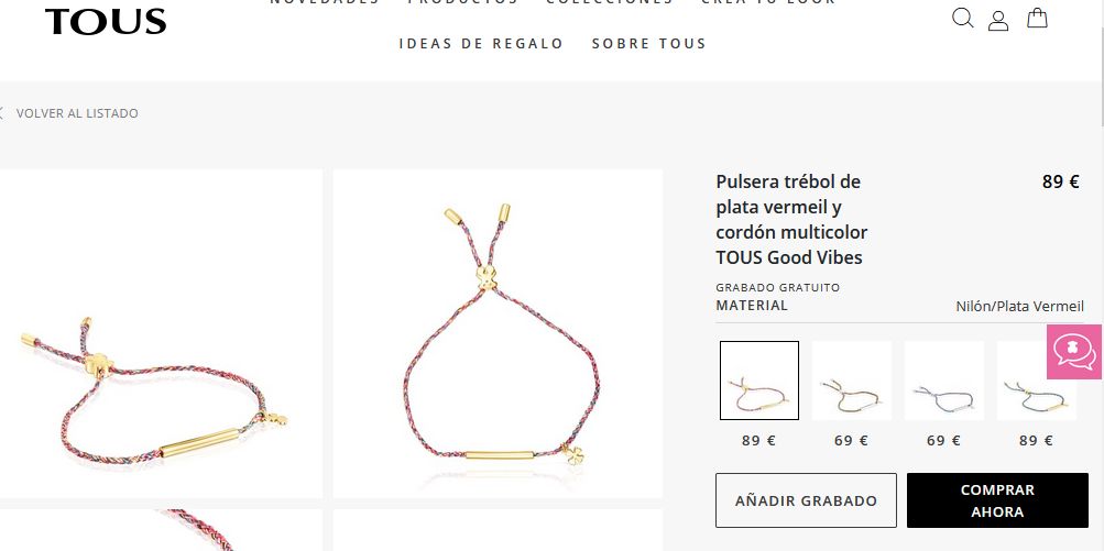 Pulsera Good Vibes de cordón multicolor de poliéster y viscosa con barra de 23mm y trébol de 6mm de plata vermeil. Cierre: Oso deslizante para ajustar la medida. Grabado únicamente disponible en alfabetos latinos. Plata de primera ley recubierta de oro de 18kt con un espesor de 3 a 5 micras y sin ningún otro metal entre ambos. Entonces, para que la puedan comprar solo deben entrar a Tous por 89 €.