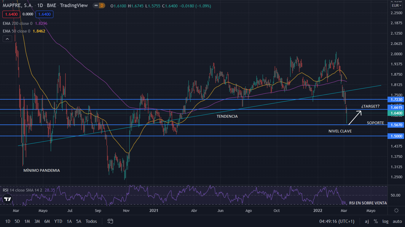A nivel técnico, desde el mínimo de marzo de 2020, Mapfre se movió en una tendencia alcista. Tras su publicación de resultados del ejercicio 2021 el pasado día 10 de febrero, Mapfre pasó a bajista, perdiendo la tendencia, y cayendo un 21%. Actualmente el precio se sitúa en los 1,64 euros, siendo su siguiente soporte (1,56 euros) un nivel calve. Tras llevar casi un mes bajista, el nivel clave y el indicador RSI en sobre venta, la proyección para el corto plazo es alcista, finalizando la fuerte caída, y situándose sobre los 1,66 euros. Para el medio plazo, hasta que el precio no de una confirmación de dirección, su proyección es lateral.