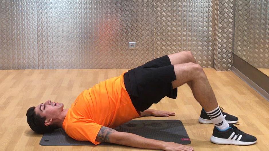 Este ejercicio se inicia en la misma posición, tumbado boca arriba, con rodillas flexionadas y los pies apoyados en el suelo. A continuación eleva los glúteos del suelo unos centímetros y mantén la posición durante 5 segundos. Apoya de nuevo el glúteo en el suelo y aprieta el abdomen como si quisieras tocar el suelo con el ombligo. Mantén esta postura unos segundos y vuelve a relajar. Después empieza de nuevo la secuencia. Repite al menos ocho veces, o más si te sientes cómodo.