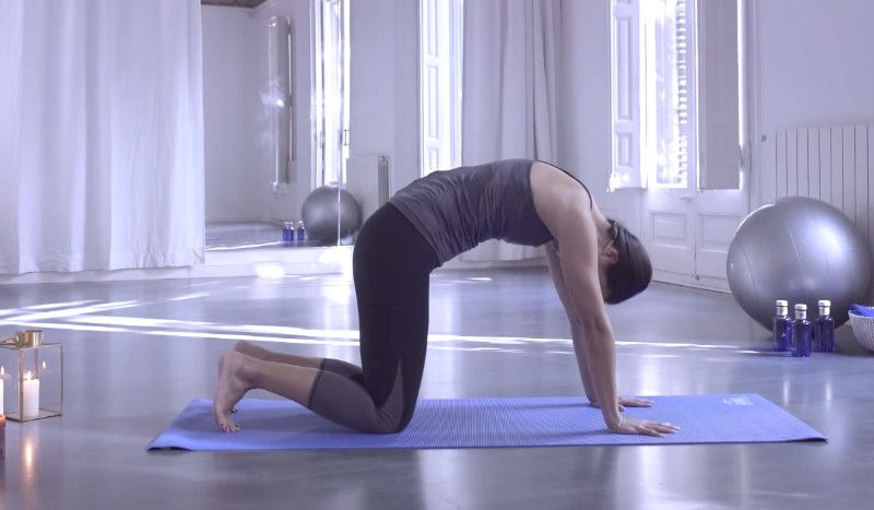 De rodillas, con las manos apoyadas en el suelo, en posición a cuatro patas, empuja el abdomen y la zona lumbar hacia el suelo, arqueando la espalda hacia abajo, y a la vez levanta la cabeza y los hombros. Después baja la frente hacia el suelo y haz el movimiento contrario, elevando las lumbares y el abdomen hacia el techo. Repite lentamente al menos unas 8 veces cada movimiento.