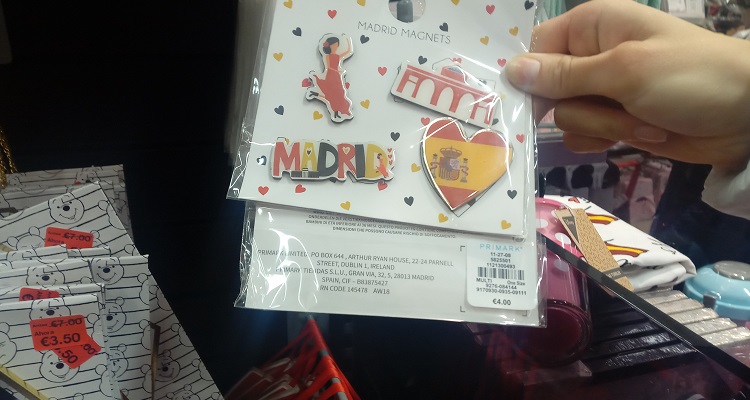 Los mejores imanes están en Madrid, y también en Primark. En este centro, venden estos estupendos imanes de la nevera que representan la ciudad de Madrid y a España. Vemos 4 imanes entre los que se incluyen un corazón con la bandera de nuestro país, una señora bailando flamenco, una edificación que no logro reconocer y una imagen con la palabra Madrid que mezcla todo lo demás.