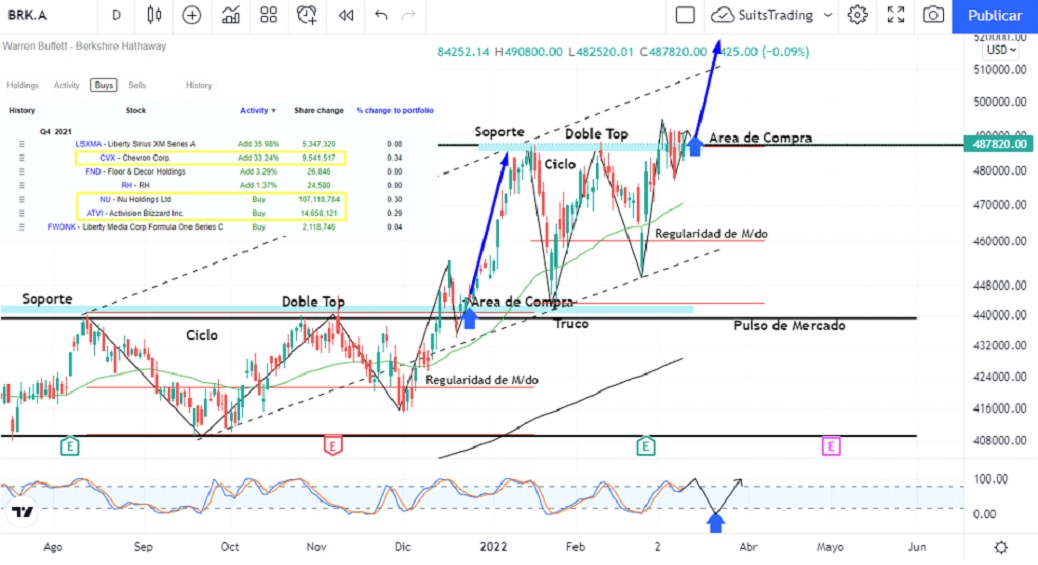 Es muy probable que en el largo plazo las acciones de Berkshire Hathaway se mantengan generando utilidades y sobre la dirección alcista que trae prácticamente desde su inicio en bolsa gracias a las maniobras que ya conocemos. Es probable que en el corto plazo desarrolle una operación técnica de espejo que se conoce por replicar de manera muy similar el movimiento del precio de la acción.