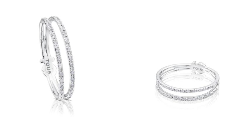 No pueden faltar en la selección modelos de Tous, siempre tan demandados en los espacios habilitados de esta marca en El Corte Inglés, siempre destacados y extensos, fruto de esa demanda. En este caso nos centramos en su variedad de anillos con diamantes y nos quedamos con este modelo original, de doble anillo en una parte, llamado Tous Diamonds y realizado en oro blanco, como el resto que veremos. Es oro blanco de 18kt y diamantes y con un peso total de 0,09ct. Lo tienes en este enlace por 460 euros.