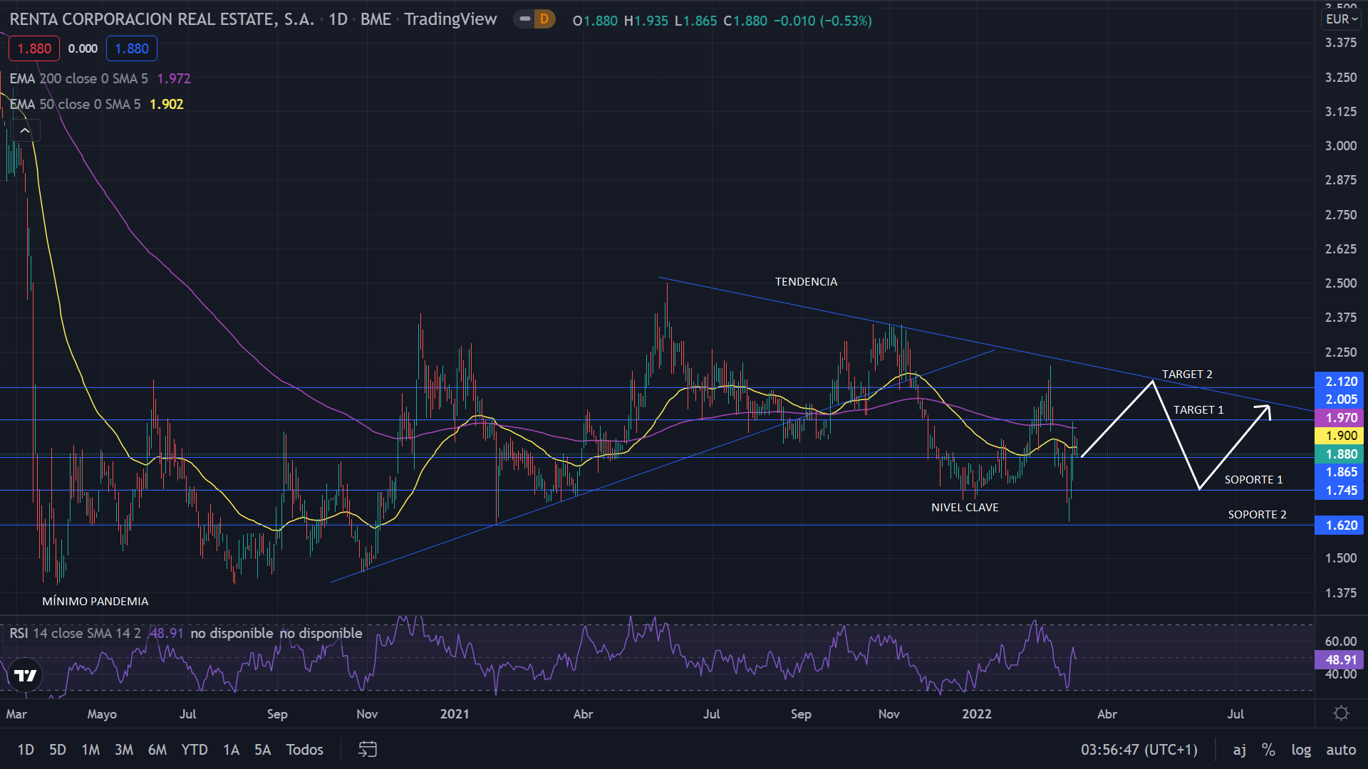A nivel técnico, Renta Corporación no consigue salir de la formación lateral, estando a un 54% de su nivel de prepandemia. Actualmente se sitúa en una tendencia bajista, con el precio en los en los 1,88 euros, siendo los 1,74 euros su nivel clave. La proyección para el corto plazo es alcista, yendo a buscar la línea de tendencia bajista, sobre los 2,00 euros. Para el medio plazo, la proyección sigue siendo lateral, y continuando con la actual tendencia.