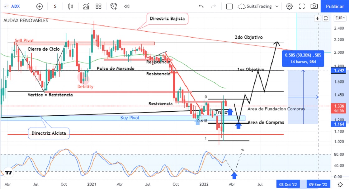 Pero lo más importante para tener en cuenta es que de cara a un futuro próximo y por culpa de los ataques de Rusia, los precios de los commodities, en especial de los energéticos, se han disparado de manera sustancial lo que repercutirá en el comportamiento favorable de la acción de Audax Renovables. Técnicamente la acción de Audax en gráfico de marco semanal viene presentando desde abril de 2020 un patrón psicológico que implica movimientos abruptos a la baja que ya se dieron y posterior a ellos, su vuelta al alza.