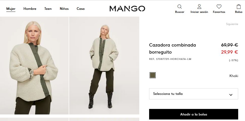Es una hermosa cazadora que posee un diseño medio y pertenece a la colección committed. Además, posee un tejido de borreguito y un diseño combinado y recto. Inclusive, posee un cuello redondo y manga larga. Posee dos bolsillos laterales y bolsillos interiores con un forro interior acolchado. Posee un cierre de botones en la parte delantera, para que lo puedan comprar solo deben entrar a Mango por 29,99 €.