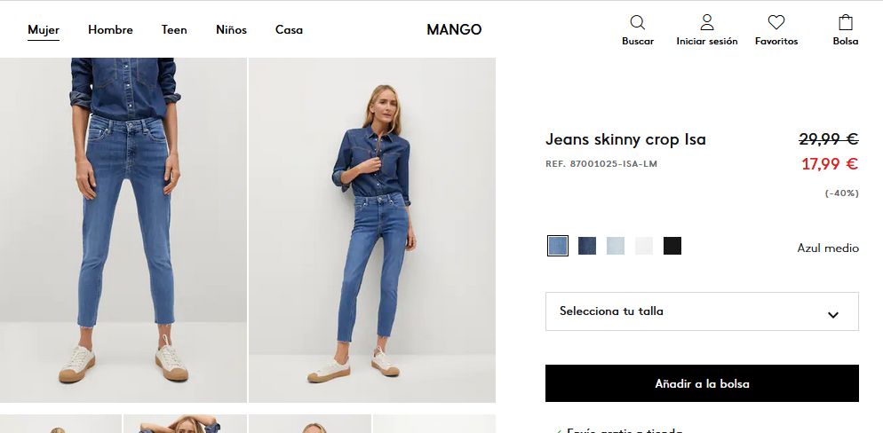 Posee un corte skinny, un diseño crop y tiro medio. Además, posee terminaciones deshilachadas con cinco bolsillos. Inclusive, posee unas trabillas en la cintura y un cierre de cremallera y botón. Por lo que, es perfecto de usar dado que es de estilo clásico, estos vaqueros son, además, elásticos. Entonces, si lo desean comprar solo tienen que entrar a Mango por 17,99 €.