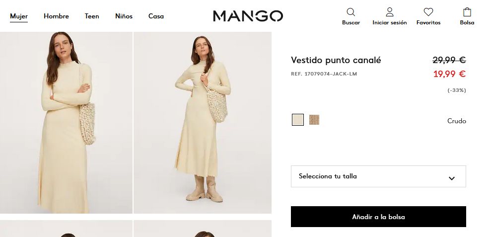 Es un hermoso vestido que está diseñado con un tejido de punto. Además, posee un diseño canalé y una textura de espiga con diseño recto y midi. Inclusive, posee un cuello Perkins con manga larga con terminaciones pespunteadas. Entonces, si desean comprar esta prenda solo tienen que entrar a Mango por un precio de 19,99 €.