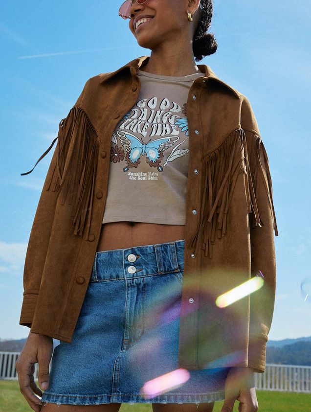 Pocas prendas tan originales se pueden encontrar a día de hoy como esta. Se trata de una sobrecamisa que está fabricada a base de ante y que, entre otras muchas cosas, destaca por tener unos flecos en las mangas. Además también destaca por tener un sistema de cierre con botones a presión y un precio muy económico, solo cuesta 39’99 euros.