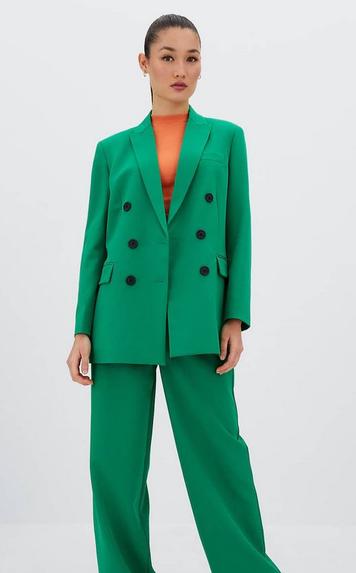 Si te gustan las chaquetas americanas de corte cruzado y que sean de color verde, pásate por Stradivarius. Porque en ella vas a poder encontrar esta tan bonita que, además, tiene los hombros marcados y unos bonitos botones a la altura del puño. Su precio es de tan solo 35’99 euros.