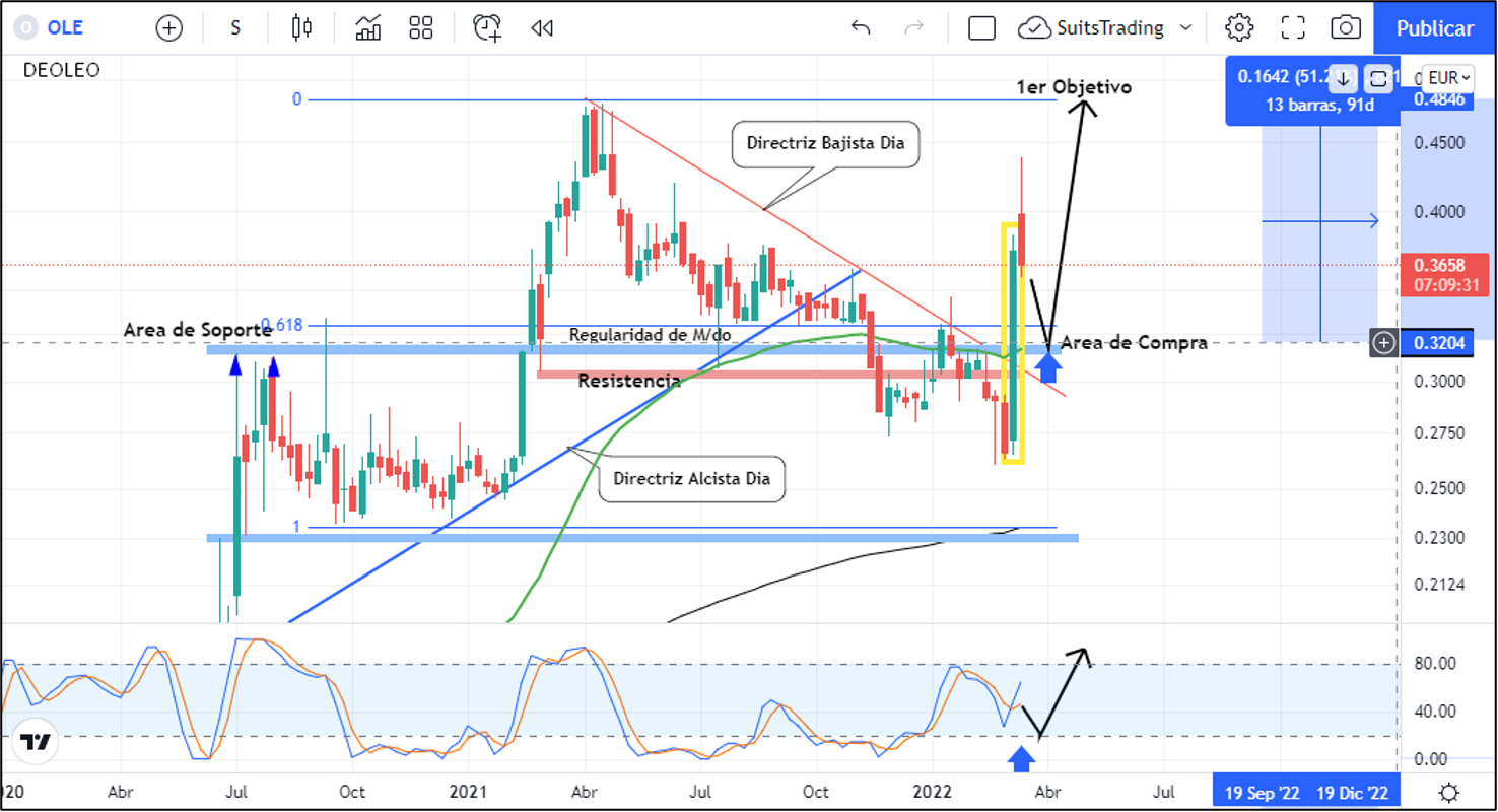 El pasado 2 de marzo compartíamos a través de nuestra web Inversión.es, una hipótesis sobre el movimiento del precio de Deoleo que podría situar la acción en máximos de abril del año pasado. Aunque de momento no cumple con dicho objetivo, el precio ha desarrollado un movimiento de impacto sólido que realiza la ruptura de la directriz bajista de marco diario y se ubica nuevamente por encima del área de soporte macro más importante de mediados de 2020. A su vez confluyen el área de regularidad en el 61,8 de retroceso de Fibonacci del último avance y la media móvil exponencial de 50 periodos de corto plazo.