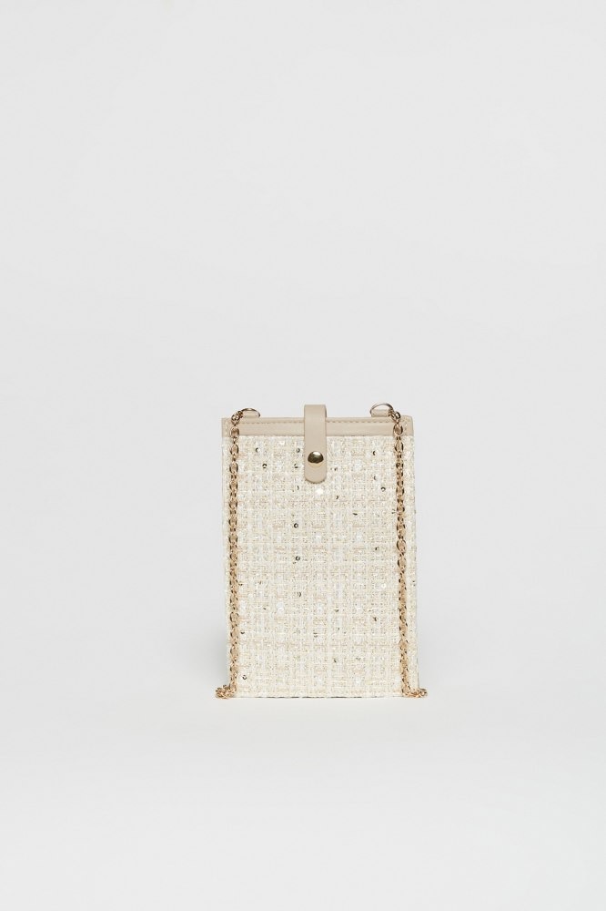 Si estás cansada de los bolsos grandes y quieres salir de casa con lo justo, te va a encantar este portamóvil. Diseño en tweed con cadena dorada que tiene un aspecto elegante y actual, perfecto para cualquier ocasión.