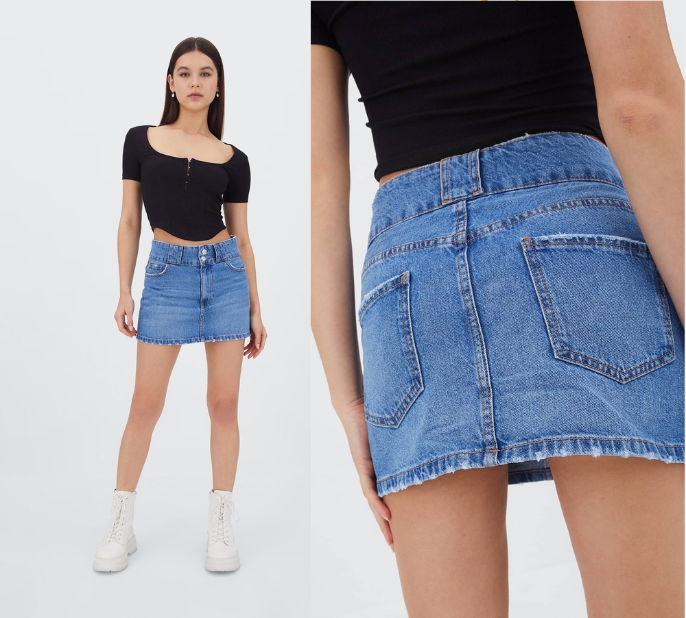 Esta falda denim low waist tiene un diseño corto, con 5 bolsillos, trinchas para usar cinturón si quieres, y con cierre frontal por cremallera y dos botones metálicos.