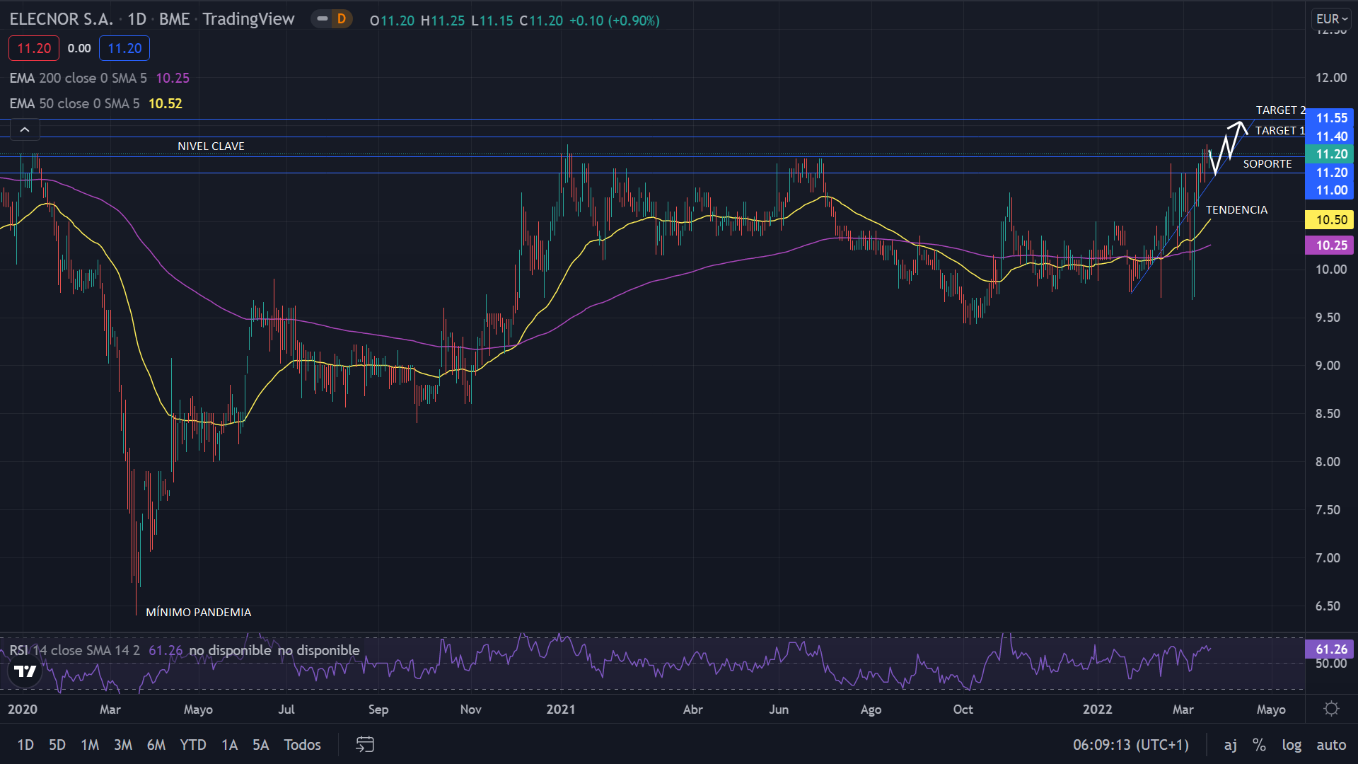 A nivel técnico, desde el mínimo marco por la pandemia, Elecnor se ha movido alcista creciendo un 75%. Actualmente el pecio se sitúa nuevamente en el nivel clave de los 11,20 euros, siendo este nivel el anterior al inicio de 2020. La proyección para el corto-medio plazo es alcista, superando dicho nivel y alcanzando los 11,55 como siguiente objetivo.