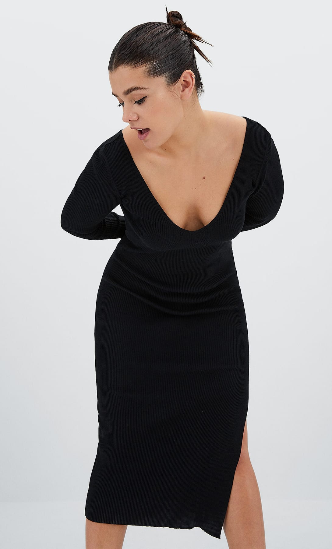 En una linda noche, donde tu hermosura, estilo y figura se combinen para atraer todas las miradas, Stradivarius tiene en sus tiendas, el Vestido midi punto escote pico. Delita a los asistentes con tu figura y busca tu más delicado collar, para que resalte sobre tu cuello.