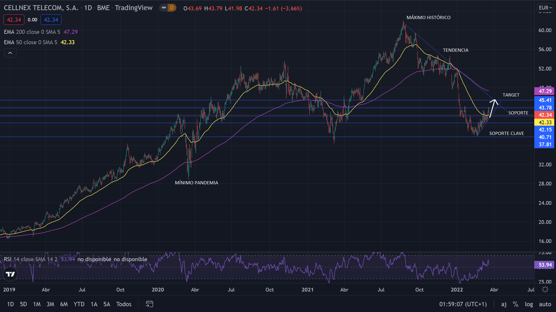 A nivel técnico, Cellnex marcó su máximo histórico en agosto de 2021, tras un crecimiento del 531% desde 2017. Tras dicho máximo, el precio pasó a bajista, cayendo con fuerza al inicio de 2022. Actualmente el precio se mueve alcista, tras rebotar en el soporte clave de los 40 euros. La proyección para el corto plazo es alcista, con los 45 euros como objetivo, justo donde se sitúa la línea de tendencia bajista.