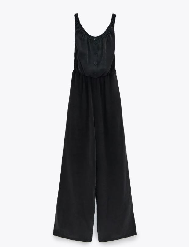 El último vestido de la nueva colección de Zara es este mono fluido de color negro. Tiene escote redondo y tirantes, cintura elástica y un detalle de botones en la parte delantera de la prenda. Tiene tallas que van desde la XS, hasta la XL.