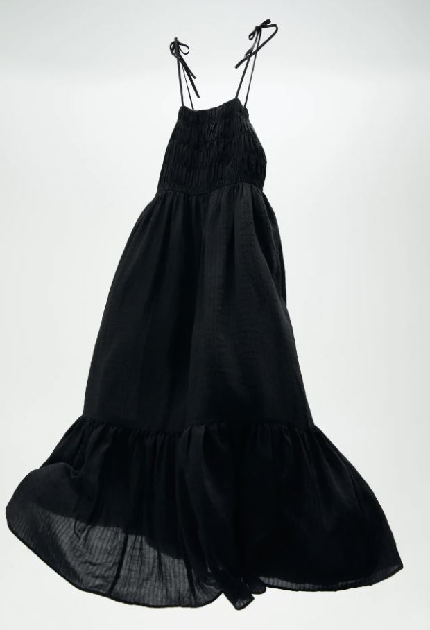 El vestido es de color negro, escote recto y tirantes ajustados muy finos y con un detalle de lazada. El bajo está acabado en volante y el cierre es con cremallera oculta en costura. Tiene desde la talla XS, hasta la talla XLL y cuesta 39,95 euros.