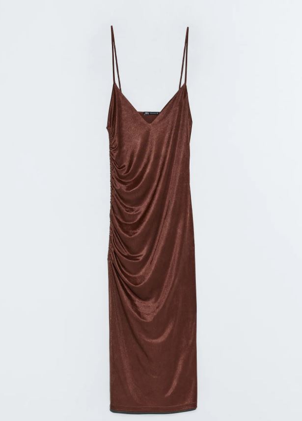 El siguiente vestido de Zara es un vestido satinado de color granate. Se trata de un vestido con escote en pico y los tirantes muy finos, sin apenas verse. Además, destaca su buen detalle del frunce elástico en sus laterales.