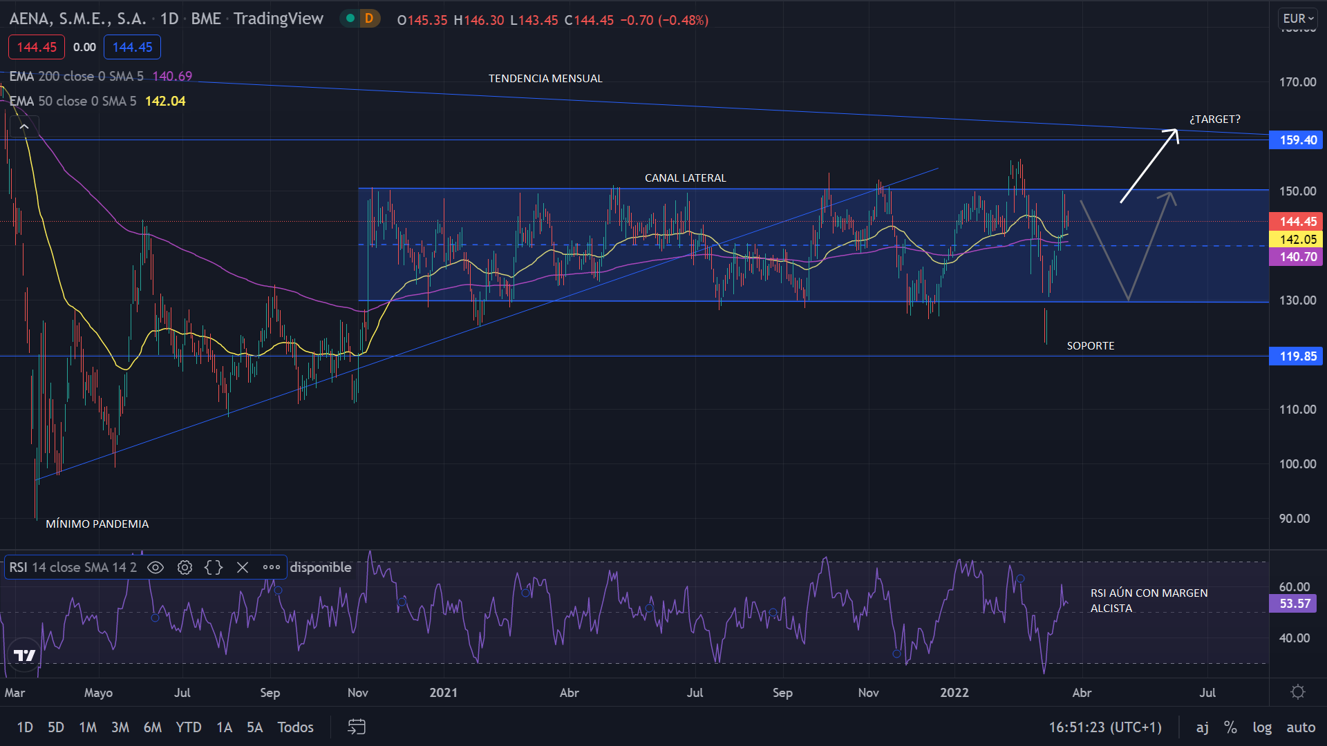 A nivel técnico, desde noviembre de 2020, Aena se ha movido en un canal lateral, entre los 150 y 130 euros. Este mes de marzo perforaba el canal, cayendo hasta los 121 euros, donde rebataba a alcista. Actualmente el precio se sitúa en la parte alta del canal, pero si tomamos el RSI como orientativo, vemos que aún el precio no está sobre comprado, lo que no podría dejar una salida del canal de forma alcista, hasta los 160 euros.