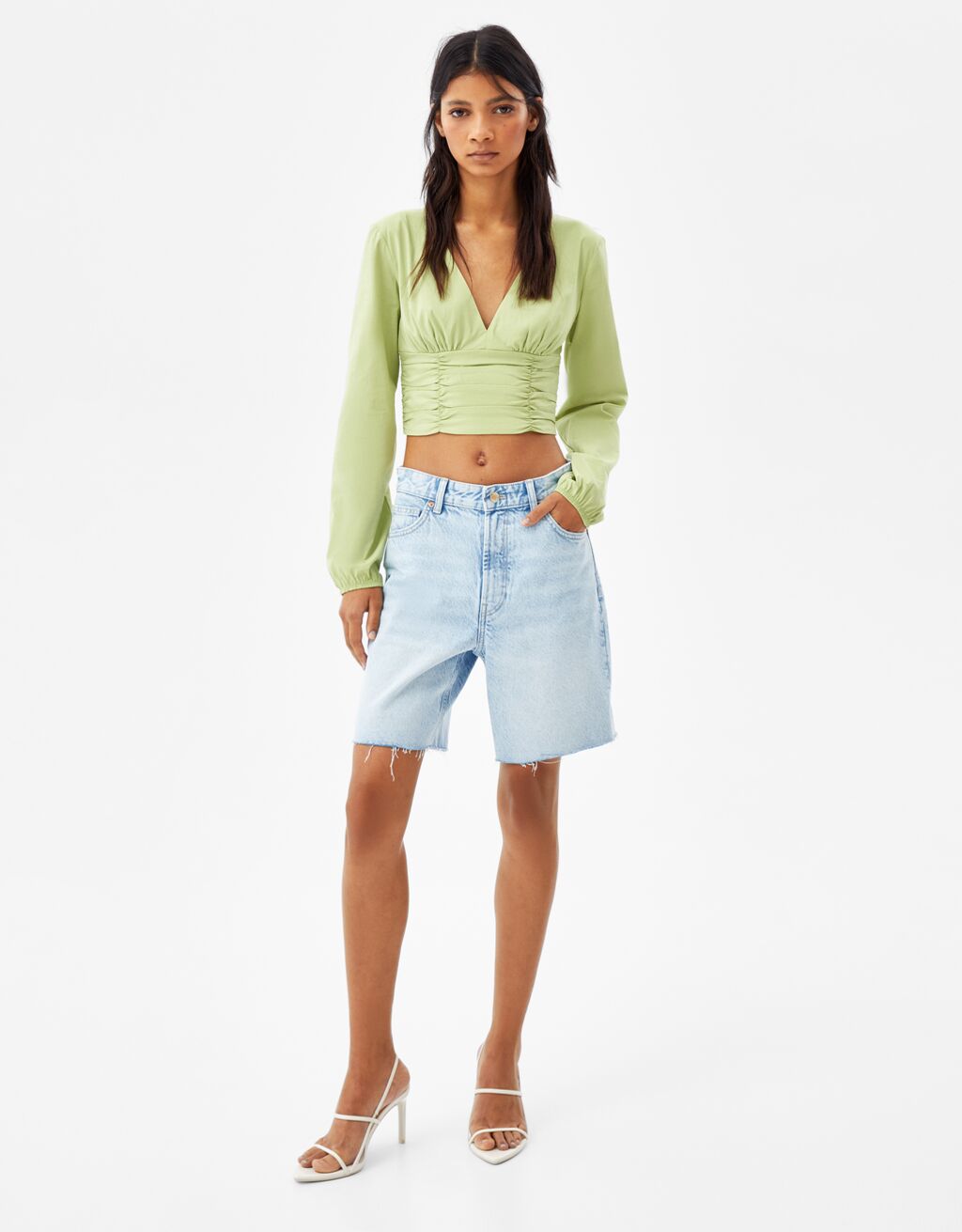 Necesitas llevar a tu closet una prenda de vestir mas forma, Bershka también la tiene. Puedes conseguir en alguna de su tiendas la Blusa manga larga escote pico ajustada fruncida.