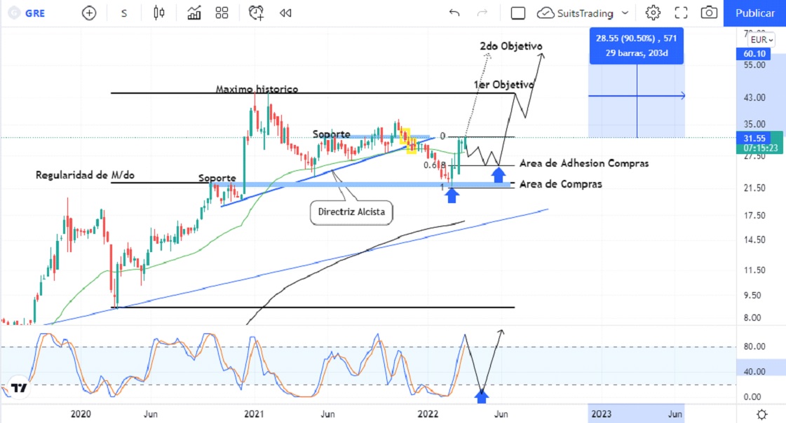 Esta empresa de energía renovable ha alcanzado una revalorización del 41,3% desde el 24 de febrero debido a la incursión de Rusia contra Ucrania. El impacto al alza en gráfico semanal suma cinco sesiones consecutivas en verde ubicándola en 31,5 euros por acción al momento de la realización de este artículo. Lo interesante es que, tal y como lo mencionábamos el pasado 30 de enero a través de nuestra web Inversión.es, “Grenergy se acerca a su área de decisión más importante, o sube +100% o pierde -60%”, la acción de Grenergy tiene un potencial hasta del 100% de beneficio con lo cual aún le queda más de un 60% de camino alcista.