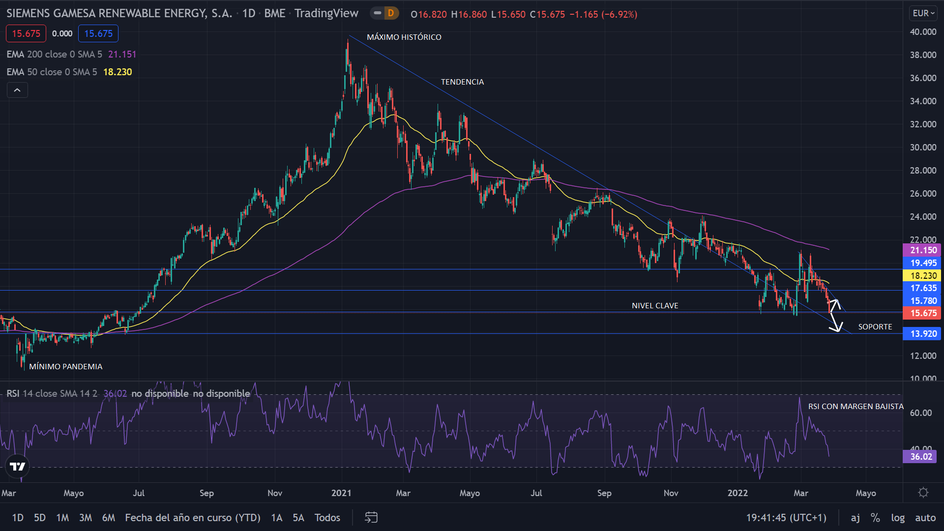 A nivel técnico, desde su máximo histórico en los 39,33 euros su precio paso a una tendencia bajista, en la que ha perdiendo un 59%. Tras tocar el nivel clave de los 15 euros, el precio salía alcista con una subida del 35% saliendo de la tendencia bajista. Pero que, tras lo anteriormente expuesto, sus acciones caían nuevamente hasta los 15,78 euros. La proyección para el corto-medio plazo es bajista, perdiendo los 15 euros, y situándose en el soporte de los 13,90 euros.