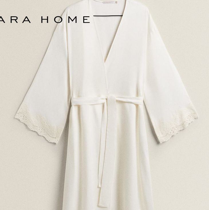 ¿Te has dado cuenta de que los kimonos se han puesto muy de moda desde hace un tiempo hasta esta parte? De ahí que nos haya llamado tanto la atención esta bata de Zara Home que justo tiene esta forma. Además de por ello, también destaca por tener una blonda en los puños, un escote en forma de pico, y por atarse con un cinturón que está adherido a la misma prenda en sí. Su precio es de tan solo 69’99 euros.