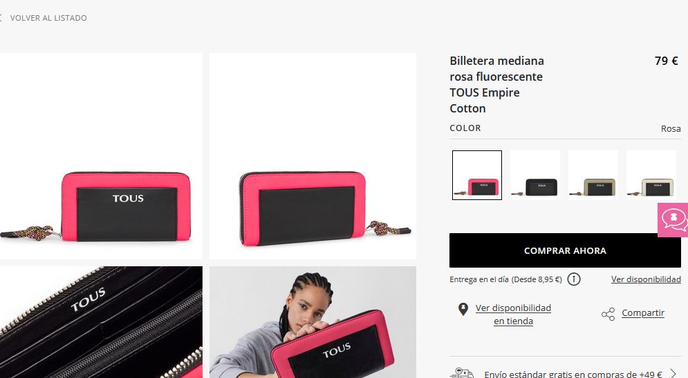 Billetera mediana elaborada en gabardina impermeable combinada con detalles de piel sintética. El cierre es con cremallera y cuenta con un bolsillo exterior abierto de rápido acceso en la parte delantera y otro en la trasera. En el interior hay un bolsillo con cremallera para monedas, 8 ranuras para tarjetas, 2 compartimentos abiertos en el centro y 2 bolsillo abiertos en los extremos para billetes o diferentes pertenencias. Para comprarlo solo deben entrar a Tous por 79 €.
